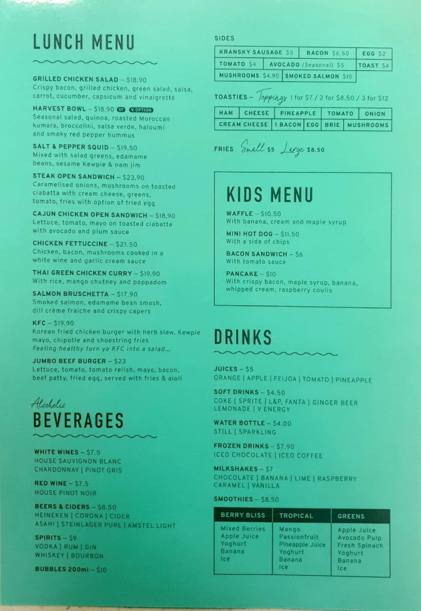 For lighter fare, you won't want to miss the Salt & Pepper Squid or the flavorful Thai Green Chicken Curry. Families can also enjoy the Kids Menu, featuring fun options like Waffles and Pancakes.